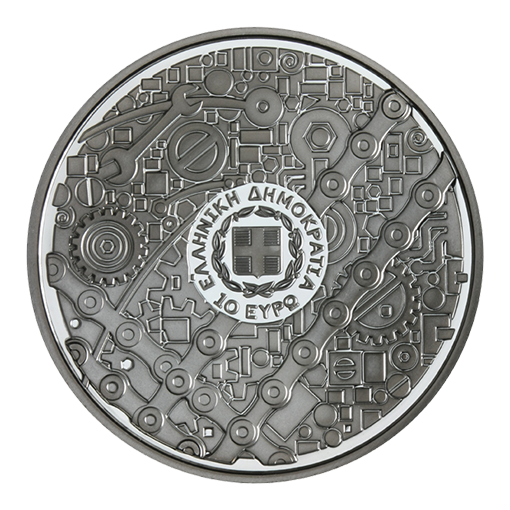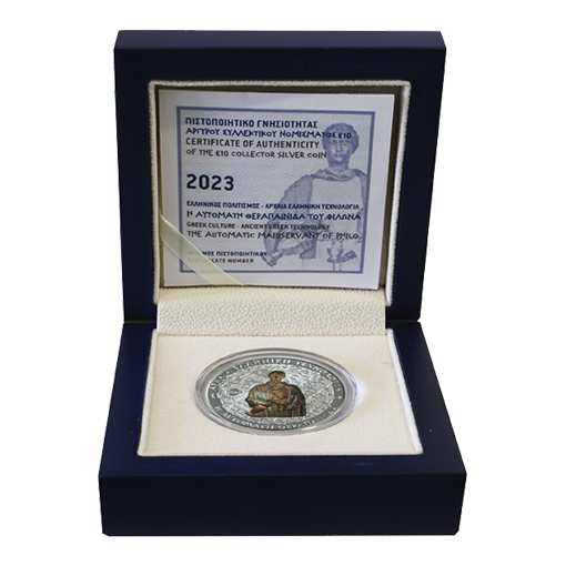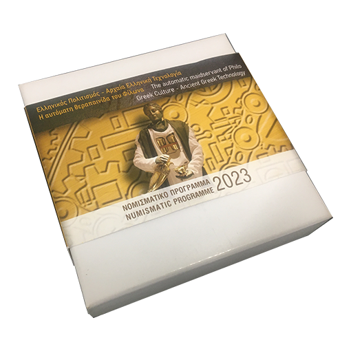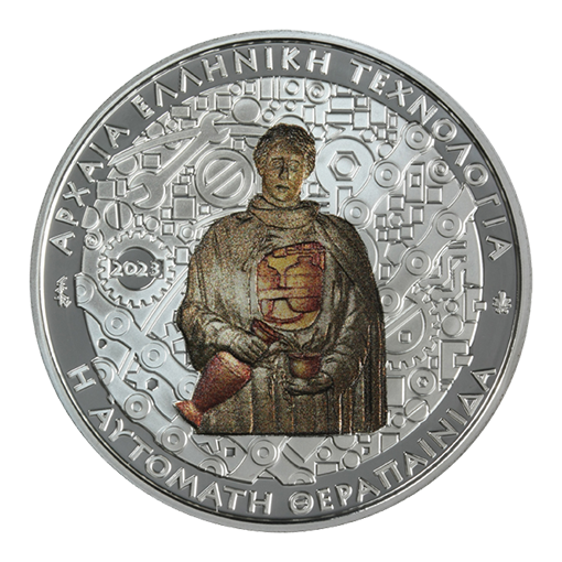 The design of Philo’s automatic maidservant on the obverse of the coin is based on a reconstruction by the Kotsanas Museum of Ancient Greek Technology.