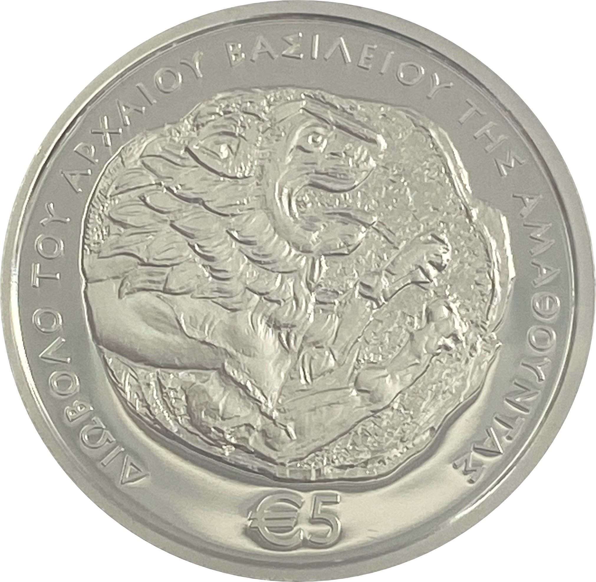 A composition depicting the head of a lion. The phrase «ΔΙΩΒΟΛΟ ΤΟΥ ΑΡΧΑΙΟΥ ΒΑΣΙΛΕΙΟΥ ΤΗΣ ΑΜΑΘΟΥΝΤΑΣ» is circularly inscribed. The coin’s nominal value of €5 is also depicted.