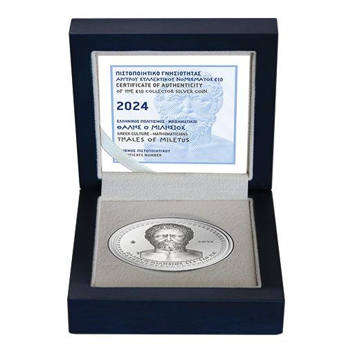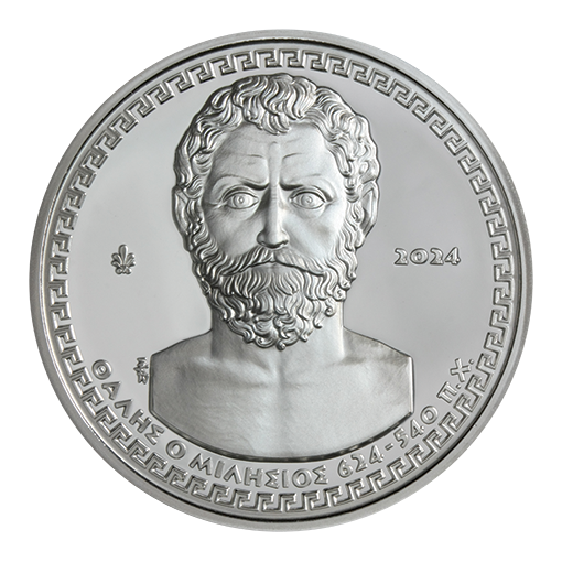 Born in Miletus, on the Ionian coast of Asia Minor, Thales (c. 624-540 BC) was the first known Greek mathematician, the first Greek philosopher and one of the seven sages of antiquity. Breaking with mythological interpretations and believing that the world can be explained as a set of natural processes, he considered water, origin of all, in the spirit of natural philosophy that he pioneered. Thales excelled in cosmology, astronomy, physics and geometry. One of his best known contributions to mathematics is Thales’ theorem, or basic proportionality theorem. Thales was said to have calculated the height of the pyramids and predicted the solar eclipse of 585 BC.
