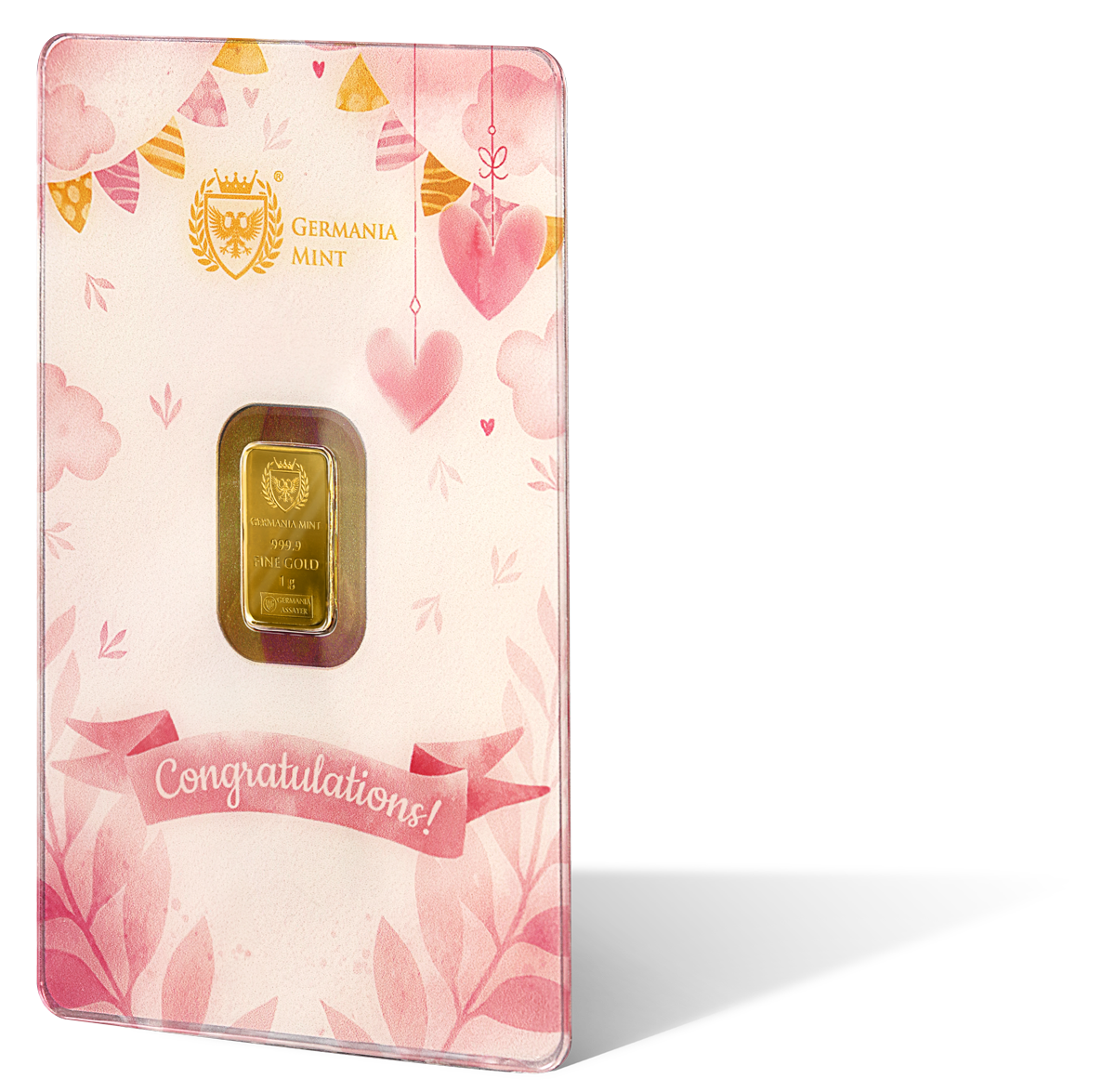 To meet customer expectations, we offer Germania Mint 1-gram gold bars in special occasion packaging, making this investment product an elegant and unique gift.