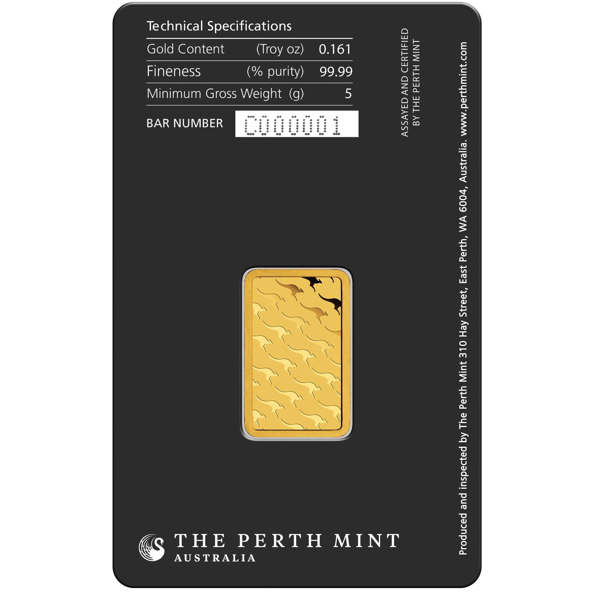 The 5g gold bullion minted bar is one of eight sizes, all with The Perth Mint’s internationally recognised ‘swan’ logo on the front and stylised kangaroo motifs on the back.
