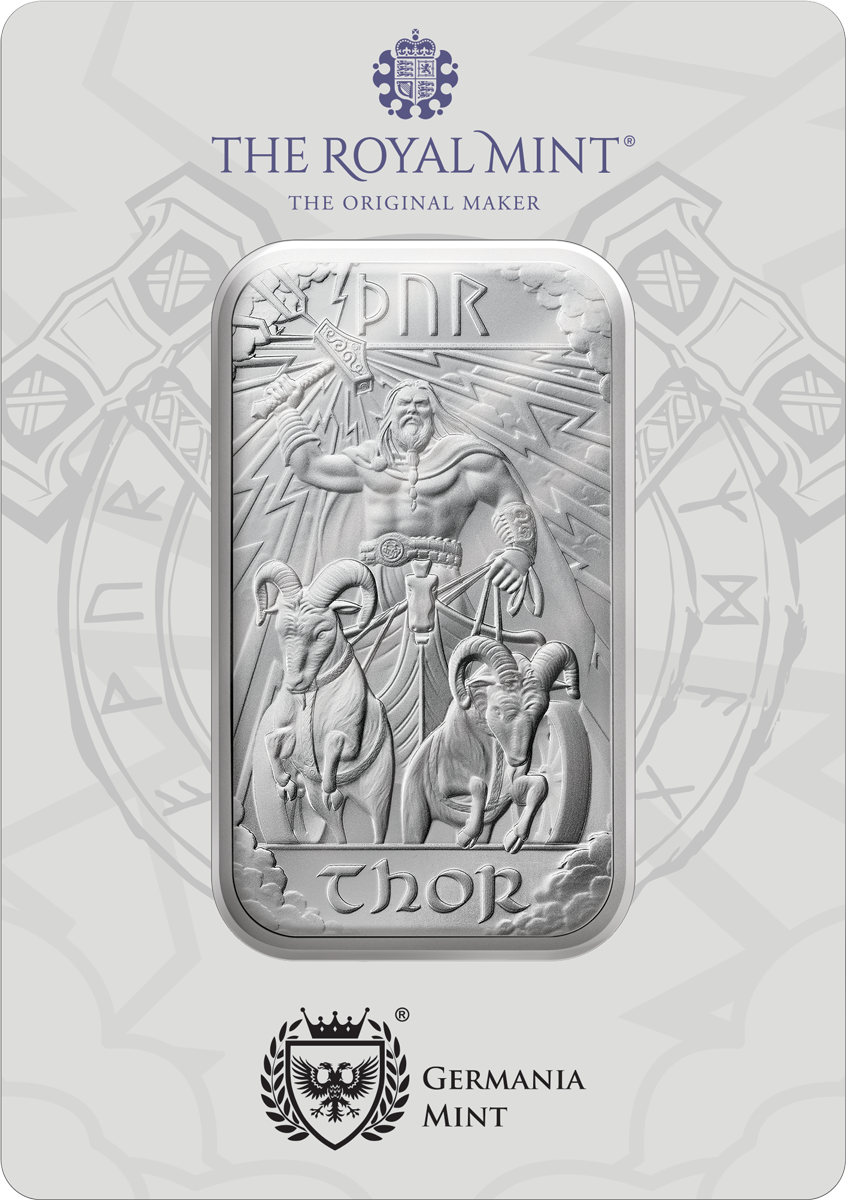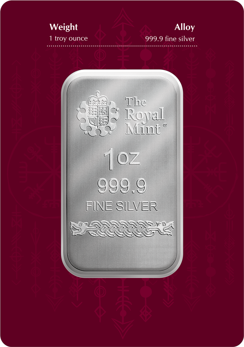 The silver bar, minted by The Royal Mint and packed by Germania Mint, is available in two sizes: 1 oz and 10 oz.