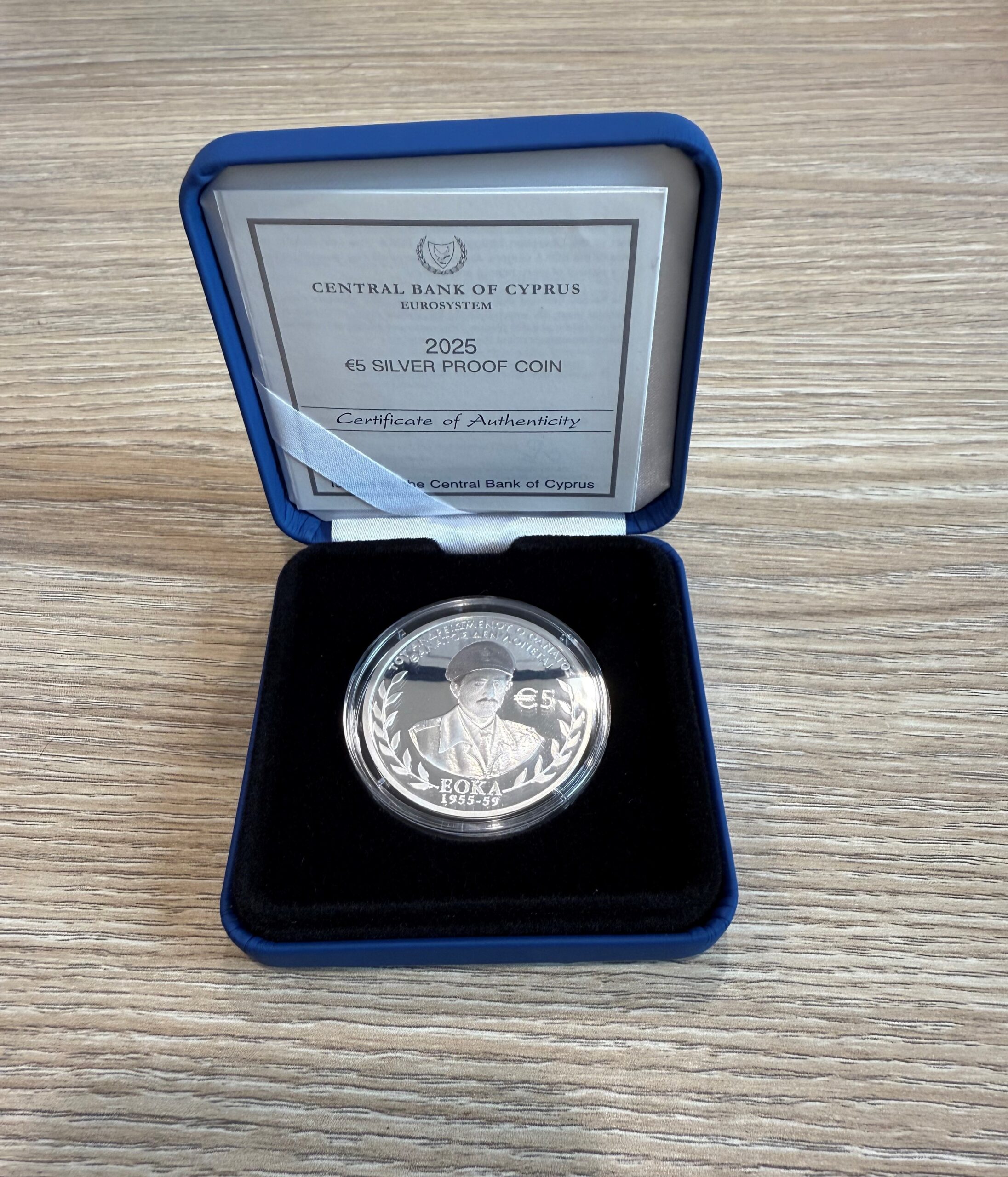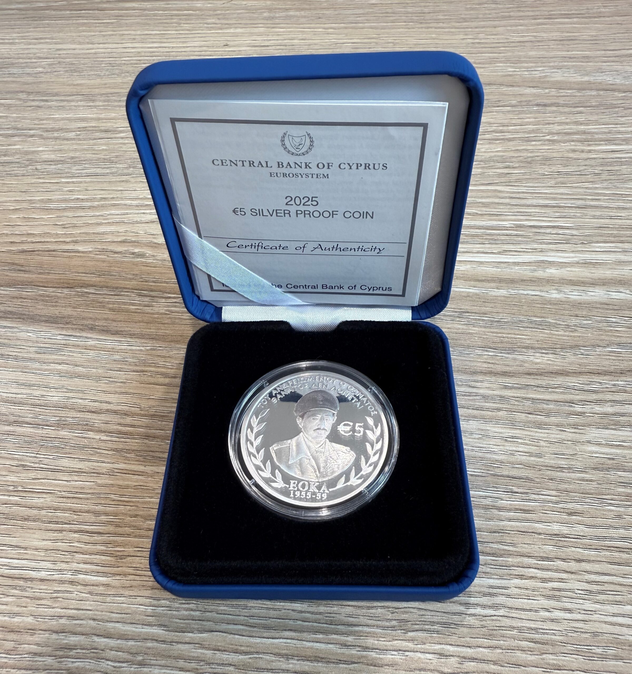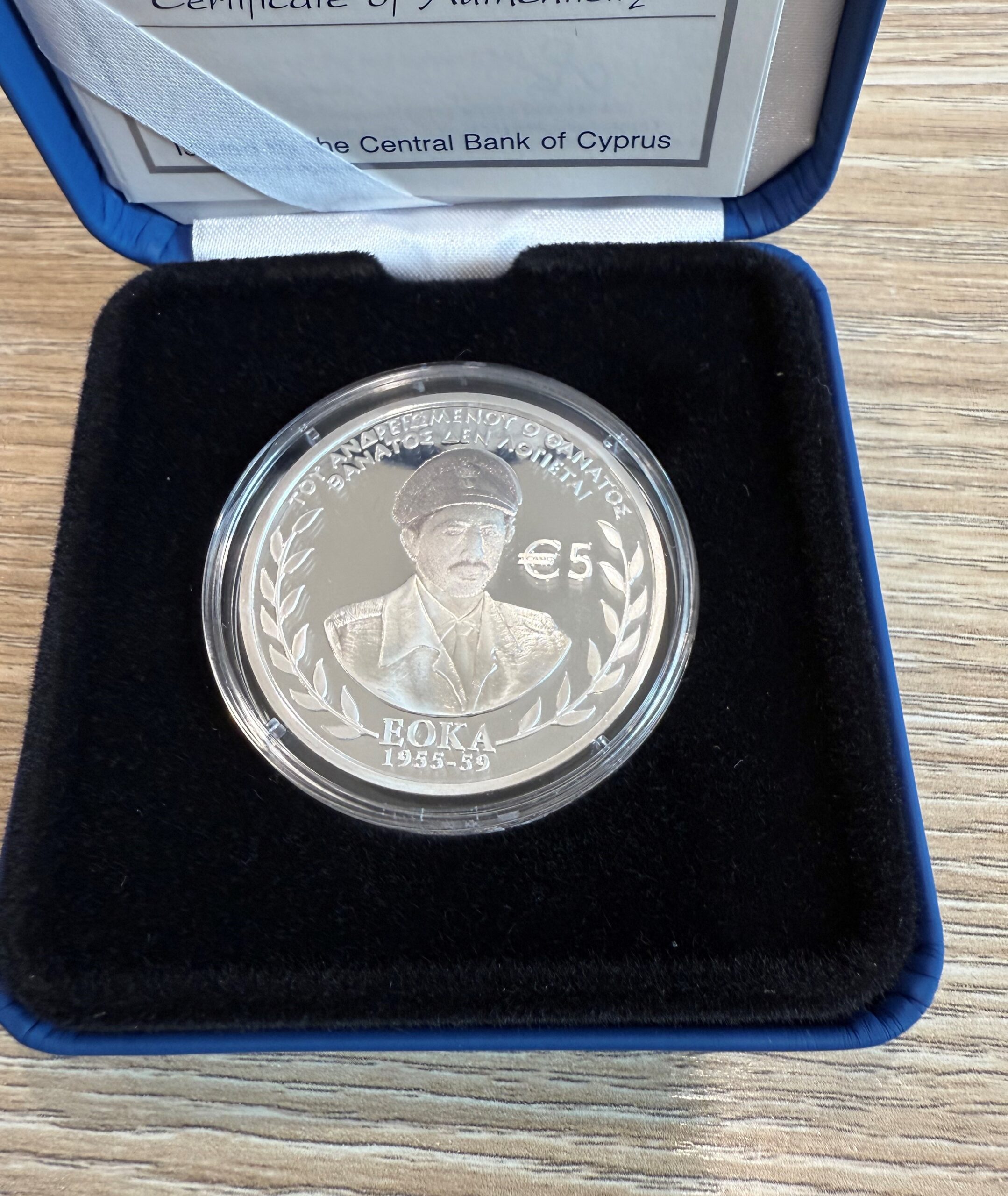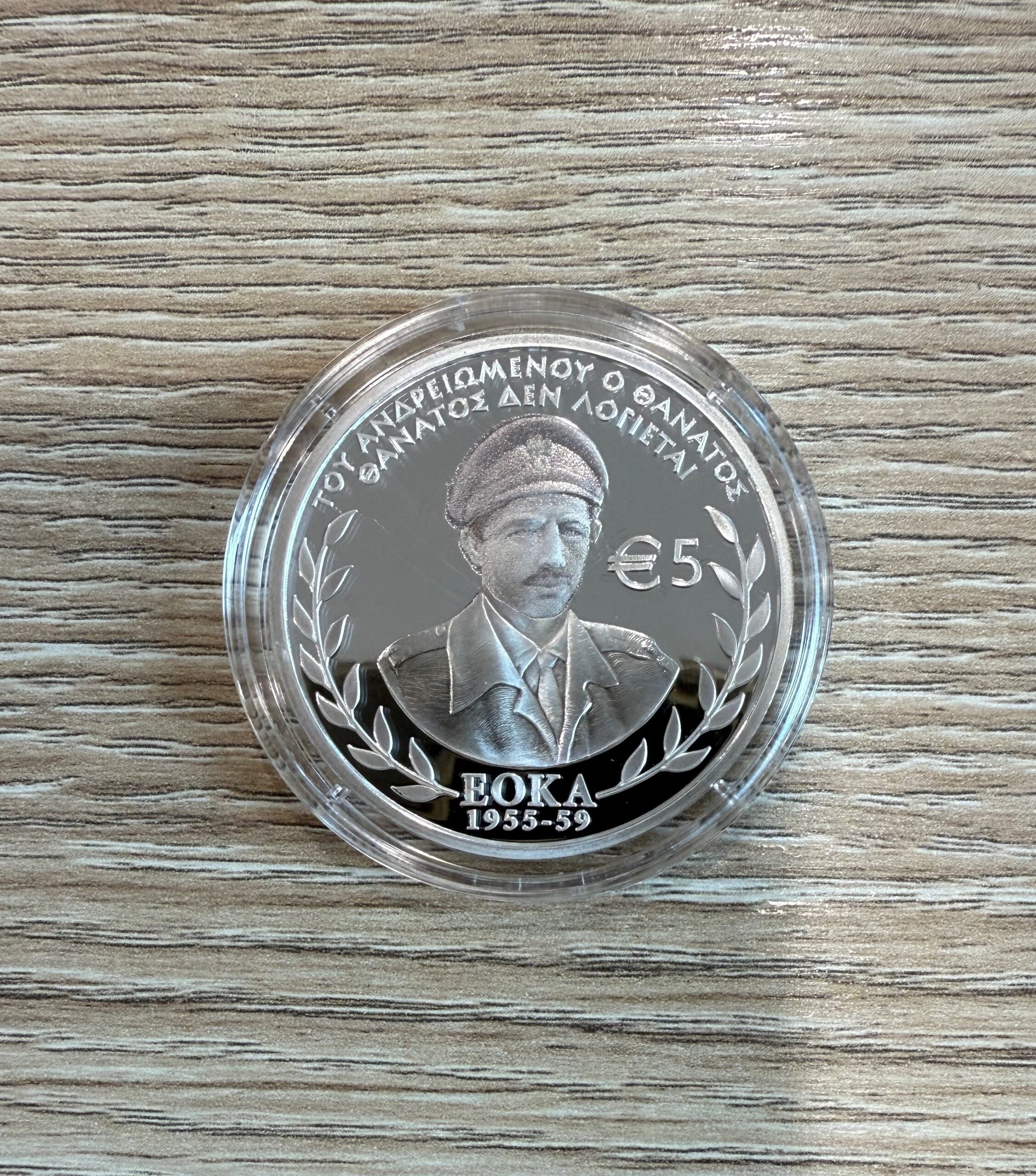 The phrase “ΤΟΥ ΑΝΔΡΕΙΩΜΕΝΟΥ Ο ΘΑΝΑΤΟΣ ΘΑΝΤΟΣ ΔΕΝ ΛΟΓΙΕΤΕ” is circularly inscribed on the top of the coin and the phrase “EOKA 1955-59” is inscribed on the bottom of the coin.